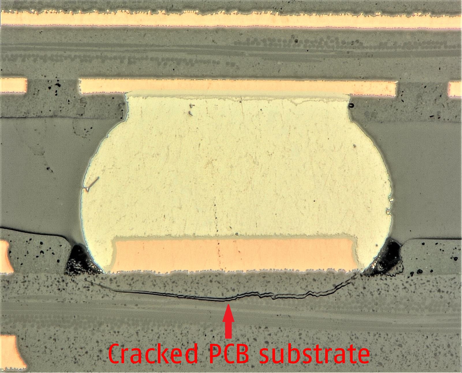 Broken Ball to PCB connection due to thermal stress & Cracked PCB top layer due to thermal stress.