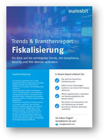 Fiskalisierungstrends 2026: 10 Trends für Compliance, Sicherheit und POS-Betrieb Die Fiskalisierung befindet sich im Wandel: Regierungen verschärfen Vorgaben, Händler skalieren Omnichannel-Strukturen, und Cyber- sowie Betrugsrisiken steigen. Unternehmen müssen manipulationssichere Transaktionsdaten, vertrauenswürdige Signaturen und prüfbare Audit-Trails über Filialen, mobiles POS, Self-Checkout, Vending und Online-to-Offline-Prozesse hinweg sicherstellen. Dieser Report zeigt den Shift zu vernetzten, resilienten und sicherheitszentrierten Modellen – getragen von hardwarebasierten, cloudfähigen TSEs in einer integrierten System- und Gerätelandschaft. Er ordnet ein, welche Entwicklungen 2026 prägen und was sie für Technologiestrategie, Rollout-Geschwindigkeit und langfristige Compliance-Resilienz bedeuten. Laden Sie den vollständigen Report herunter und richten Sie Ihre Fiskalisierungsstrategie auf die nächste Welle an Compliance-, Auditability- und Retail-Security-Anforderungen aus. Im Report erfahren Sie u. a.: