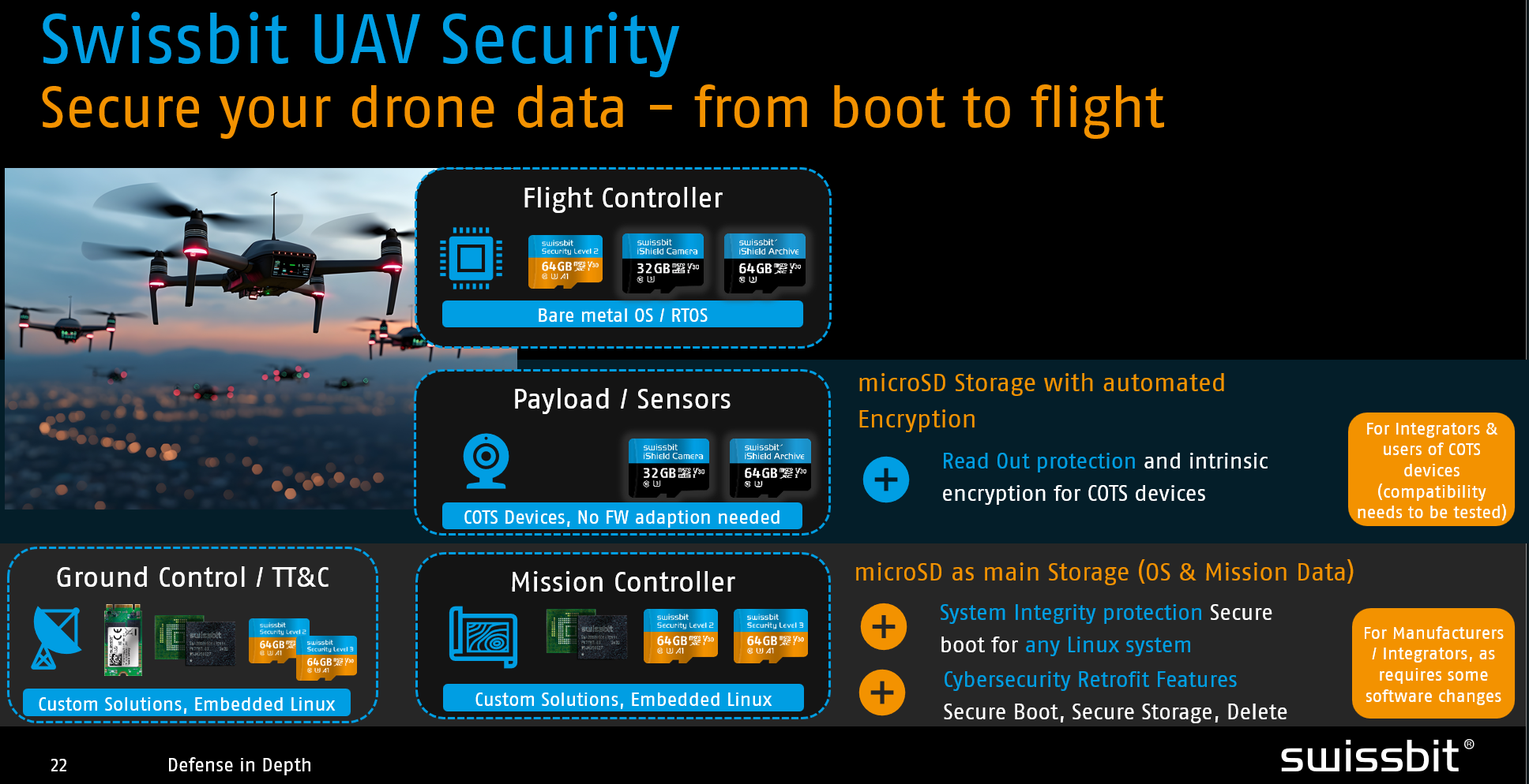 - Drone Defense Systems: Swissbit S-600u MicroSDs power the detection systems that safeguard critical infrastructure from rogue UAVs.