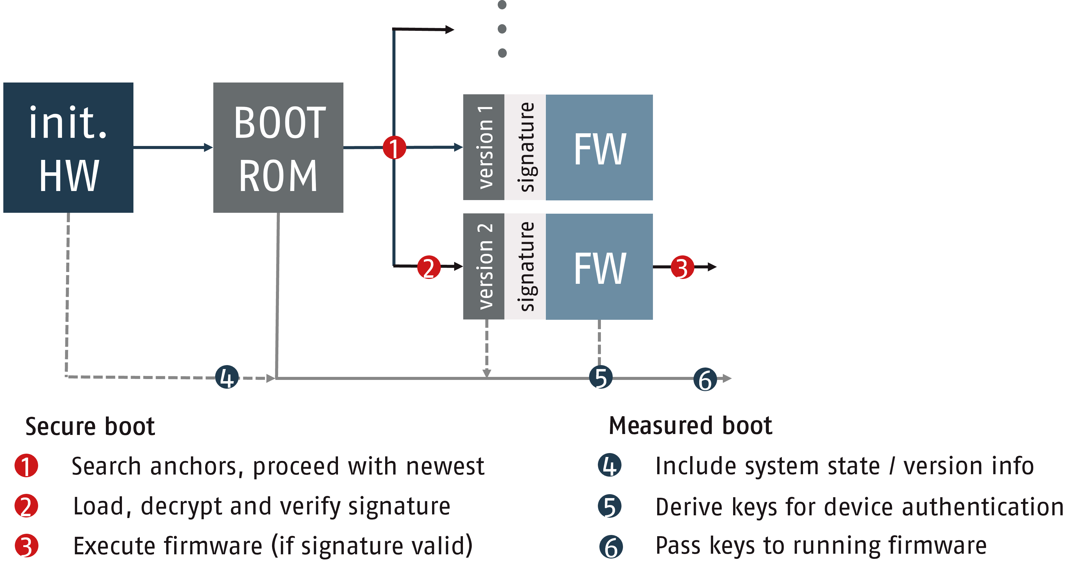 <em>Figure 1: The process of secure boot. Measured boot in contrast does not enforce a secure system state but reports the systems state to verifiers. It is often implemented in conjunction with secure boot.</em>
