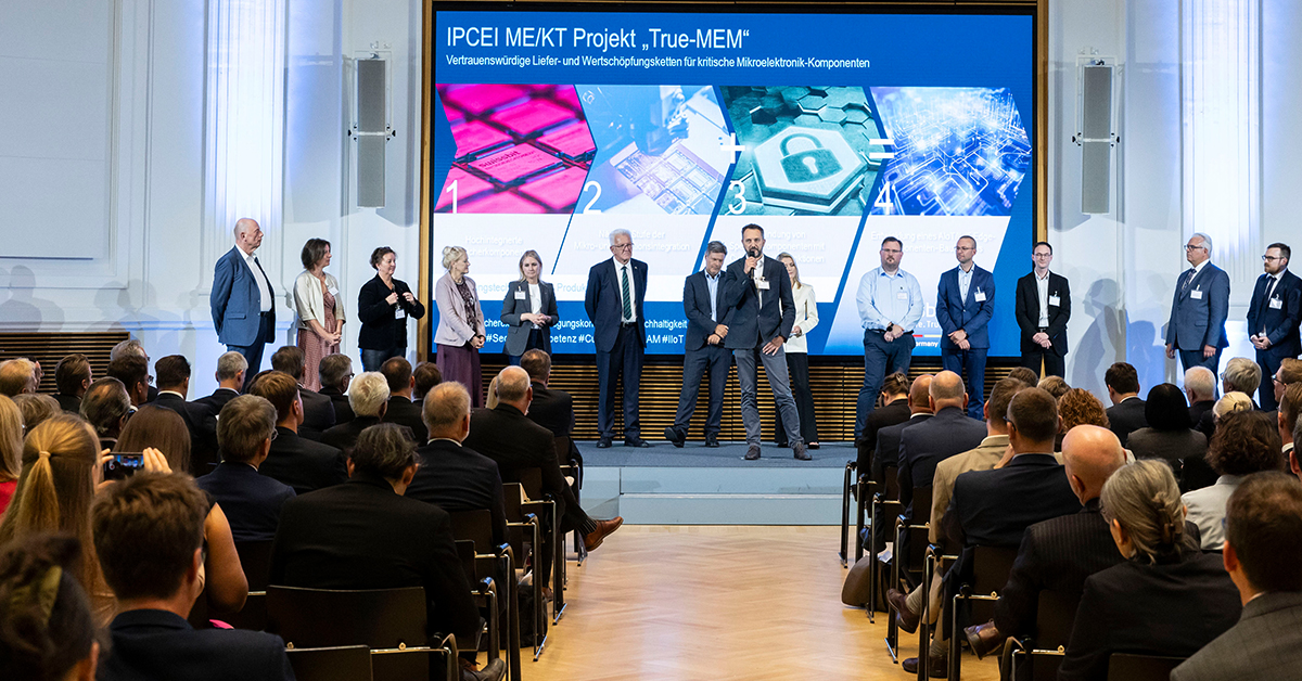 Home game for Swissbit: The official kick-off for the largest EU semiconductor initiative, the IPCEI ME/CT, took place in Berlin on September 18. Under the title “Microelectronics: Key to Transformation,” more than 160 invited guests gathered for the event at the Federal Ministry of Economic Affairs and Climate Action. Alongside Germany’s Federal Minister for Economic Affairs and Climate Action Robert Habeck, the event was also attended by the Minister Presidents of Saxony and Baden-Württemberg, Michael Kretschmer and Winfried Kretschmann, along with other notable guests. As part of the program, the representatives of the companies involved in the IPCEI ME/CT had the opportunity to briefly present their funding projects – combined with the symbolic pledge of a funding intent by Robert Habeck. On behalf of Swissbit, Lars Lust, General Manager APATS (Advanced Packaging, Assembly & Test Solutions) and Member of the Board of Swissbit Germany AG, presented the key points of the “True-MEM” project.